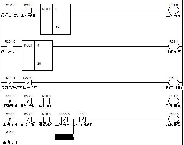 ????? 主軸定向功能可以通過(guò)M代碼開(kāi)始,也可以通過(guò)手動(dòng)方式下面板的按鍵開(kāi)始。定向的開(kāi)始條件為主軸轉(zhuǎn)速必須處于零速度。主軸定向開(kāi)始時(shí)將通過(guò)置主軸定向標(biāo)志G402.12,定向完成以后通過(guò)清除該標(biāo)志來(lái)取消定向,以便下一次定向的開(kāi)始。如果換到松緊燈亮?xí)r,不允許主軸定向,否則報(bào)警。