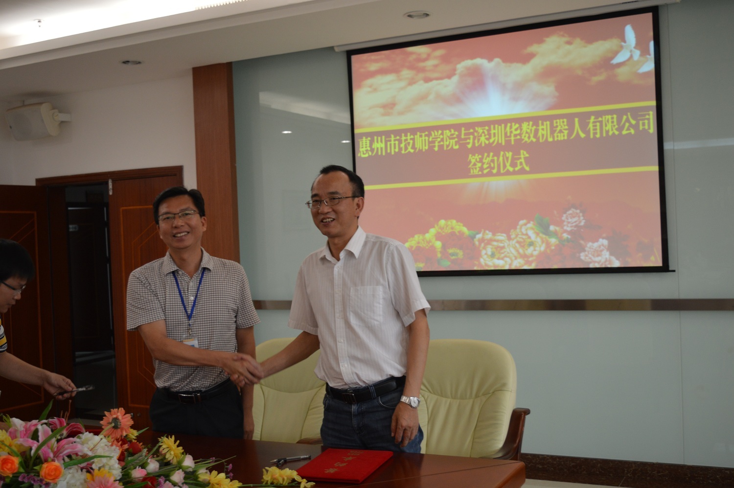 2016年6月7日,惠州市技師學(xué)院與深圳華數(shù)機(jī)器人簽約儀式隆重舉行。惠州市技師學(xué)院譚院長、分管校企合作黃院長、校企合作處朱處長、制造工程系邱主任、金主任出席簽約儀式,武漢華中數(shù)控股份有限公司副總裁、深圳華數(shù)機(jī)器人有限公司總經(jīng)理熊清平,副總經(jīng)理?xiàng)钪镜瘸鱿敬魏灱s儀式。 ? ?