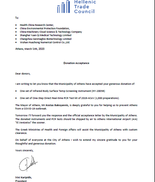 當(dāng)前,新冠肺炎疫情正在全球多個(gè)國家蔓延擴(kuò)散。截止3月20日,希臘共和國累計(jì)確診新冠肺炎病例增加到近500例。面對新冠疫情快速蔓延,希臘共和國總理米佐塔基斯稱“希臘處于戰(zhàn)爭狀態(tài),但我們必將獲勝”。他強(qiáng)調(diào)當(dāng)前希臘政府的首要任務(wù)是“挽救生命”,希臘共和國政府已經(jīng)出臺一系列措施進(jìn)行防疫抗疫。3月20日,在中華環(huán)境保護(hù)基金會的協(xié)調(diào)下,武漢華中數(shù)控股份有限公司(簡稱華中數(shù)控)通過希臘共和國駐中華人民共和國大使館,向希臘共和國捐贈一臺HY-2005B紅外智能測溫儀,支援希臘共和國政府開展防疫抗疫工作。為此,雅典市市長專門發(fā)來感謝信,感謝華中數(shù)控為希臘疫情防控提供幫助,據(jù)悉,本次捐贈的紅外智能測溫儀將用于雅典國際機(jī)場海關(guān)旅客的體溫檢測。