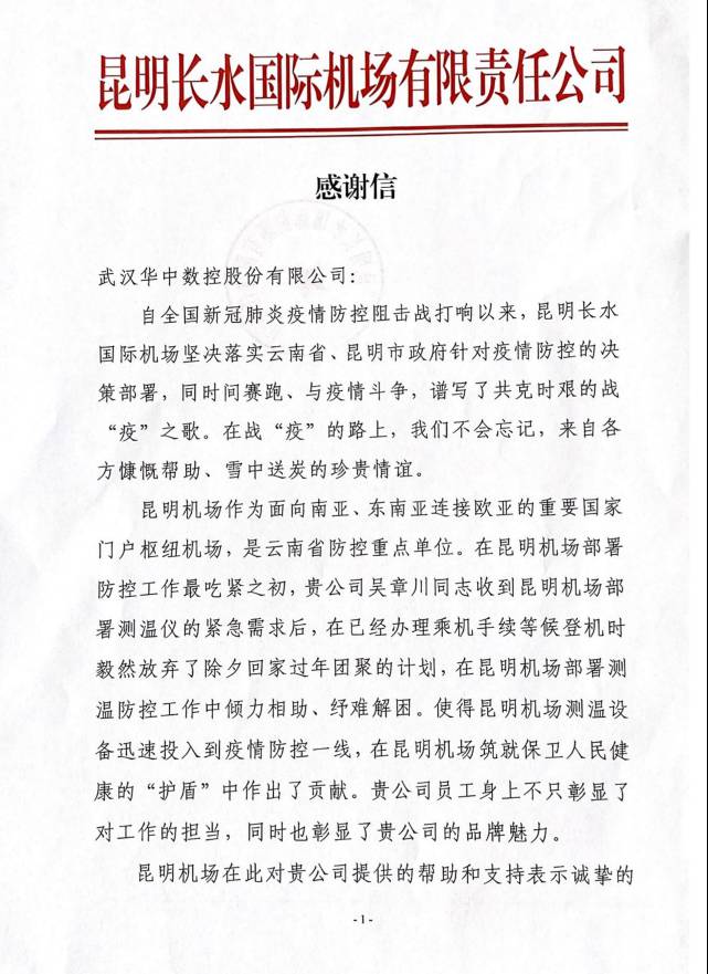 ?近日,為進(jìn)一步加強(qiáng)境外疫情輸入防控工作,做好出入國(guó)內(nèi)、國(guó)際候機(jī)樓人員體溫檢測(cè)工作,云南機(jī)場(chǎng)集團(tuán)公司緊急安排在昆明機(jī)場(chǎng)安裝30套紅外智能體溫檢測(cè)儀,其余30多套紅外設(shè)備安裝在云南其余地市州機(jī)場(chǎng),而在此之前已經(jīng)有近200多套安裝在云南省各地市州,這些設(shè)備均由武漢華中數(shù)控股份有限公司自主研發(fā)生產(chǎn)。昆明機(jī)場(chǎng)作為面向南亞、東南亞連接歐亞的重要國(guó)家門戶樞紐機(jī)場(chǎng),是云南省防控重點(diǎn)單位,華中數(shù)控此次全力配合機(jī)場(chǎng)防治疫情各項(xiàng)工作嚴(yán)而有序展開,為云南人民構(gòu)筑起一道安全的防疫“天線”。為此,昆明機(jī)場(chǎng)專門發(fā)來(lái)感謝信,感謝華中數(shù)控為貴司疫情防控提供幫助。